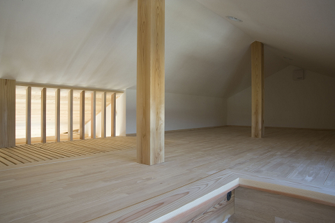 2階廊下です 吹抜けの天井は松 廊下は直上は杉のスノコでロフトの床になっています